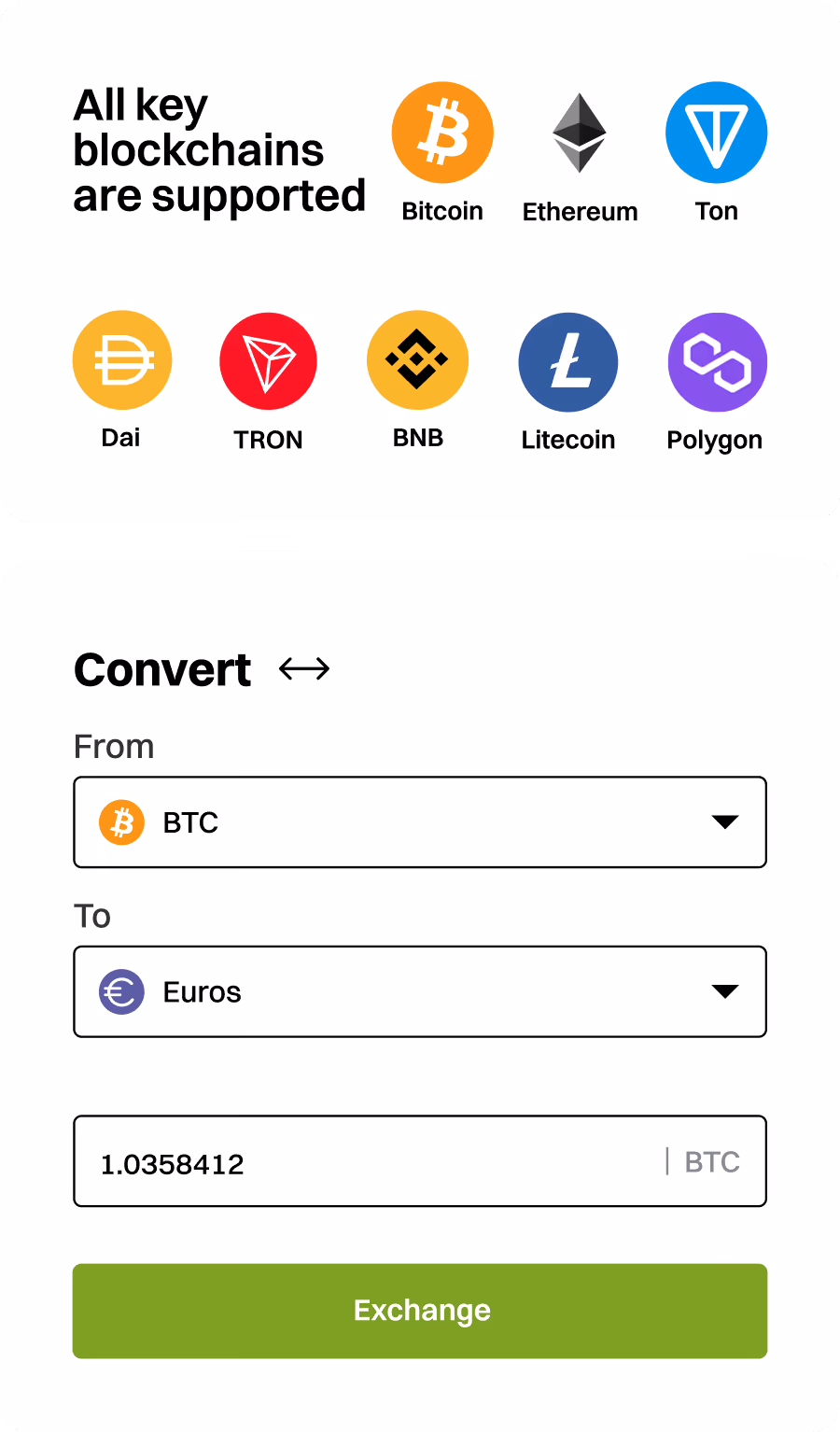 Seamless crypto-to-crypto and crypto-to-fiat transactions. EURO SEPA & SWIFT Transfers